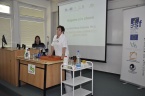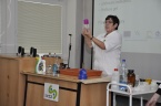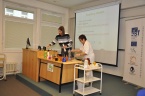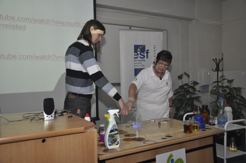 Přednášku vedla doc. Marie Solárová, která učí didaktiku na katedře chemie PřF OU, při pokusech jí asistoval student doktorského studia z katedry chemie Mgr. Tomáš Zelenka a vydatně pomáhaly také další studentky učitelství chemie Marcela Pytlíková a Ivana Felgenträgerová. Akce měla úspěch, všechny účastníky to evidentně bavilo – věříme, že si všichni nejen rozšířili svoje znalosti, ale načerpali také inspiraci pro další studium tohoto zajímavého přírodovědného oboru.