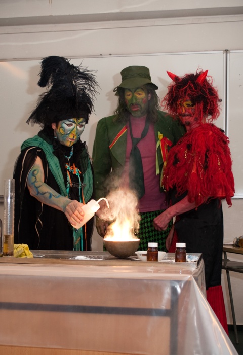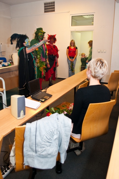 Rozprávku odohrali v piatok 8. 10. 2010 o 15.00 v priestoroch budovy Prírodovedeckej fakulty. Zvedavcov, ktorí chceli získať predstavu o „Ohni a vode“, ako sa predstavenie volalo, bolo toľko, že bežne nie príliš zaplnená školská učebňa, doslova praskala vo švoch. Dospelí sa schuti zasmiali na dvojzmyselných replikách „Voda oheň zabíjí a já myslel, že si s Laiterou trochu užiji.“