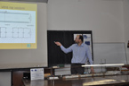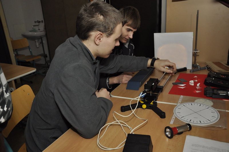 Ve druhé části semináře, která probíhala v laboratoři optiky, sledovali studenti například demonstraci spektrálních vlastností různých zdrojů světla v porovnání s běžným denním světlem ze slunce (žárovka, zářivka, LED dioda, UV LED dioda, monitor) a dozvěděli se, zda jsou tyto zdroje vhodné pro lidské oko. Všichni tento výklad poslouchali s velkým zájmem, protože jde o záření z předmětů, které nás běžně obklopují. Pak si pohrávali s laserem, kde zkoumali ohyb na mřížce a prohlíželi si hologram, který je doslova fascinoval. Studenti dále s využitím ICT (Informační a komunikační technologie) odvozovali závislosti osvětlení na vzdálenosti od zdroje světla pomocí čidla a luxmetru od Vernieru (čidlo reaguje na intenzitu světla a k měření využívá ultrazvuku) a také si sestrojili projektor diapozitivů, rozkládali světlo pomocí hranolu a hráli si s hranoly a světlem.